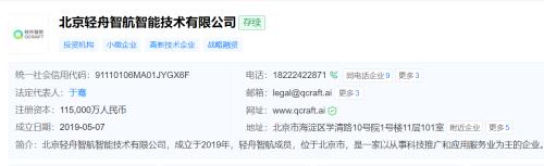该公司成立于2019年5月,法定代表人为于骞,经营范围含应用软件服务、计算机系统服务、基础软件服务、软件咨询、人工智能应用软件开发、人工智能行业应用系统集成服务、信息系统集成服务、智能车载设备销售等。股东信息显示,该公司由轻舟(香港)科技有限公司全资持股。