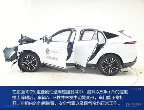 威飒在C-NCAP碰撞测试中拿到了五星的安全评价,从测试总得分情况来看,车辆在三个测试项目中所获得的成绩均大幅领先已测车型的平均水平,其主要的失分来源于正面50%重叠移动渐进变形壁障(MPDB)碰撞试验,以及灯光性能上。