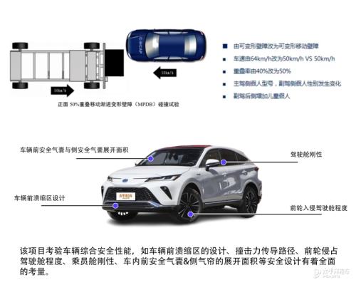 正面50%重叠移动渐进变形壁障碰撞替代了正面40%重叠可变形壁障碰撞试验及评价方法,试验车辆与MPDB台车分别以50km/h的时速,进行正面50%偏置对撞,整个碰撞测试对比旧规更加贴近现实碰撞的场景。