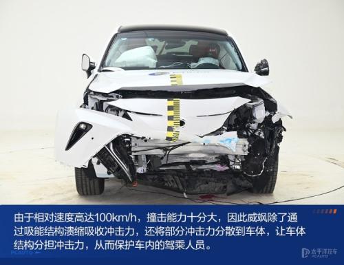 前后排的安全气囊都能正常打开,假人坐姿均十分正常,未见假人与内饰有明显的接触,最终,正面50%重叠移动渐进变形壁障(MPDB)碰撞试验得分为18.534分(满分24分)。相比旧规固定式正面40%偏置碰撞,由于试验车辆与MPDB台车进行的是相对运动,因此两车相对速度高达100km/h。而旧规中,试验车辆与固定壁障碰撞,由于壁障为静止状态,因此碰撞时速仅为测试车辆的64km/h。相比之下,新规对比旧规在撞击时所产生的能量变大,这让车辆得到高分的难度大增。还有就是渐进变形壁障相比可变形壁障,更贴近车辆实际的缓冲结构,能最大程度模拟实际车辆碰撞的场景。
