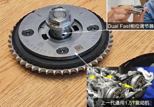 正时系统是非常有聊头的部分,从外观上我们就能看到通用上一代1.5T发动机与全新直接的区别,这个部件可以说是进行了全面重新的设计,新加入的Dual Fast相位调节器,通过电子系统控制螺栓中间的孔洞调节其中的液体来改变正时系统转动的速度节奏,从而改变凸轮轴转动,控制气门控制进气排气。这套系统可以说能够做到最为精细的控制,相比老款的DVVT技术只能在几种设定好的进排气模式之间切换不同,新系统可以实时控制凸轮轴,达到持续连续可变气门的效果,目前在所有正时技术中可以说是比较先进也是非常流行的。