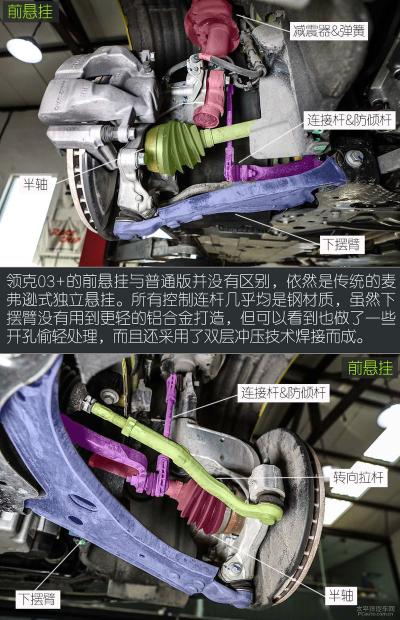 领克03+采用了麦弗逊式独立前悬挂,大部分车也都是这种形式结构,虽然各支撑杆还是钢质,但也有偷轻处理,并且羊角是选用了铝合金材质打造,以达到了尽可能轻量化的目的。