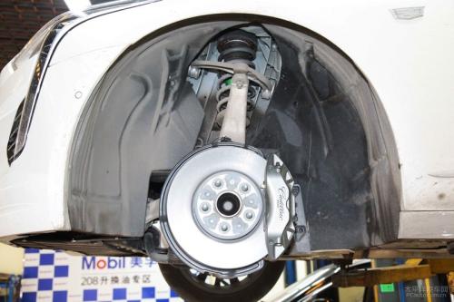 一眼望去,CT6的前悬挂使用了“海量”的铝合金部件,几乎是市面上你能买到的用料最棒的车型:各条控制臂、轴承座(也称转向节)、刹车卡钳均采用了铝合金的材质,能大幅降低簧下质量,对悬挂响应速度/车头贴地性的提升立竿见影。