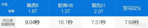 从测试数据上来看,虽然瑞虎8 1.6T车型相对于领克01 2.0T和宝马325i来说都慢了一秒出头,但与此同时瑞虎8也相对这两款车有着更大的车身尺寸和车身重量,所以如果单看发动机的动力储备,其实与主流的2.0T发动机十分接近。