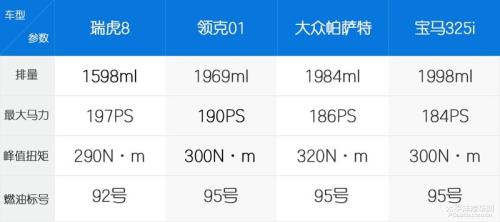 目前主流的中高端车型都配备2.0T的发动机,从领克01、大众帕萨特到宝马3系均如此,奇瑞却将期间车型的发动机排量定在1.6T。通过对比,我们发现瑞虎8这套1.6T的发动机并没有让我们失望,在最大马力上,比领克01、帕萨特、宝马325i都要高,略微偏低的是峰值扭矩。更值得留意的是,另外几款2.0T的发动机官方标注燃油标号均为95号以上的汽油,而瑞虎8 1.6T发动机只需要加92号汽油,这又一定程度节省了用车成本。
