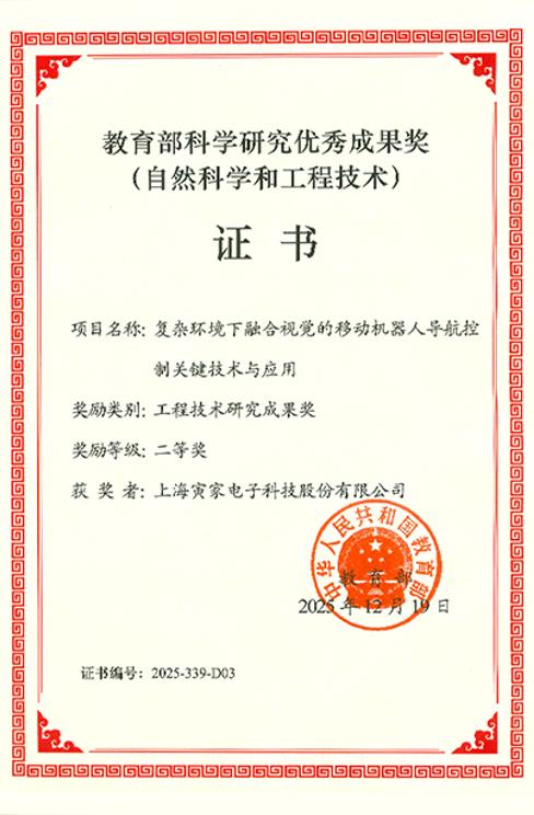 近日,寅家科技凭借“复杂环境下融合视觉的移动机器人导航控制关键技术与应用”项目,获得教育部科学研究优秀成果奖(工程技术研究成果)二等奖。该奖项在高校及科研体系中评审严格,此次获奖体现了寅家科技在工程技术研发层面的扎实积累。