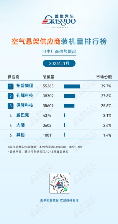 从2026年1月的空气悬架装机量数据来看,国内市场延续了自主厂商主导、头部高度集中的竞争格局。拓普集团以55,265套的装机量和39.7%的市场份额稳居行业龙头。孔辉科技和保隆科技分别以38,309套、35,609套装机量,以及27.6%、25.6%的市场份额,分别位列二三位,与拓普集团共同构成行业核心阵营,三者合计占据超92%的市场份额,梯队格局清晰且稳定。