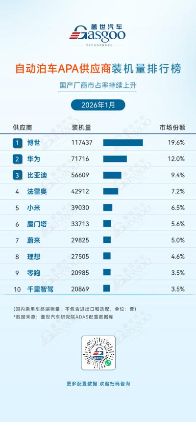 从2026年1月的自动泊车APA供应商格局来看,国内市场呈现出国际巨头领跑、本土厂商加速追赶的格局。博世以117,437套的装机量和19.6%的份额稳居第一。华为、比亚迪分别以12.0%和9.4%的份额紧随其后,展现出本土企业在智驾泊车领域的强劲竞争力,也印证了“国产厂商市占率持续上升”的现象。