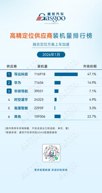 从2026年1月的高精定位装机量数据来看,导远科技以47.1%的市场份额稳居首位,装机量达116,918套,占据了近半数的市场份额,显示出其在车规级高精定位领域的规模优势与客户覆盖深度。华为、华测导航、时空道宇及毫厘智能等本土企业位居其后,在不同细分场景中形成差异化布局,凭借在融合定位算法、多源感知融合与车规级可靠性上的优势,成为多家车企高阶智驾方案的核心选择。与此同时,其他供应商合计占据22.7%的市场份额,表明高精定位市场仍保持一定的多元供给结构,为新进入者及细分技术路线保留了发展空间。