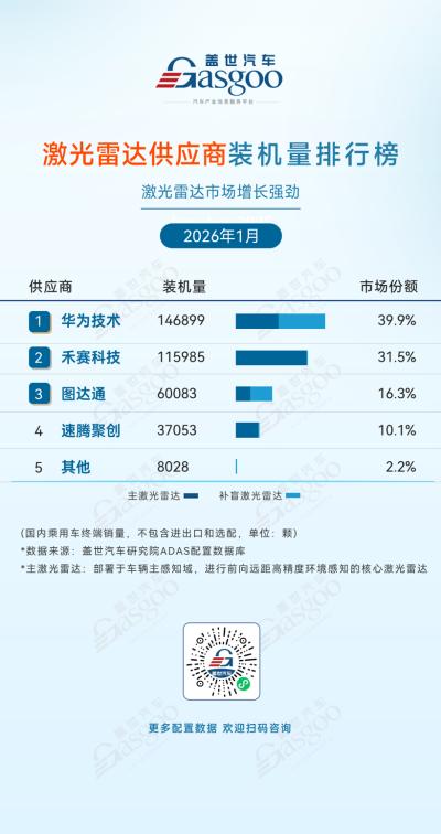 图达通,2026年1月装机量60,083颗,市场份额16.3%。