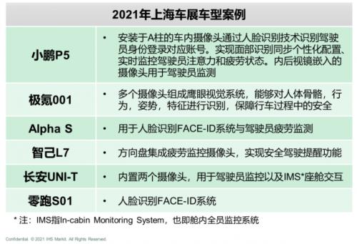 在2021年的上海车展上,小鹏P5、极氪001、智己L7、阿尔法S等新发布的车型中,座舱内都搭载了不只一个摄像头,这些摄像头主要用于人脸识别FACE-ID和驾驶员疲劳监测。