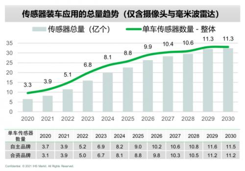根据IHS Markit的统计,2020年平均单车状态的传感器数量是3.3个,包括车载摄像头、毫米波雷达、体征测试传感器等等。而到2030年,单车传感器将达到两位数,平均每辆车有11.3个传感器。这其中座舱内用到最多的就是车内摄像头和麦克风。