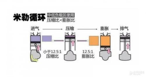 这台加装了增压装置的1.5T采用米勒循环(Miller Cycle),依然实现了“膨胀比大于压缩比”,不过实现方式不同,米勒在进气行程结束之前一点点关掉了进气门,如此一来可以在低负荷区间省更多燃料。