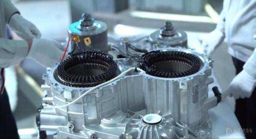 上方的铸铝箱体是双电机控制器。体积小,集成化程度高,NVH更佳。