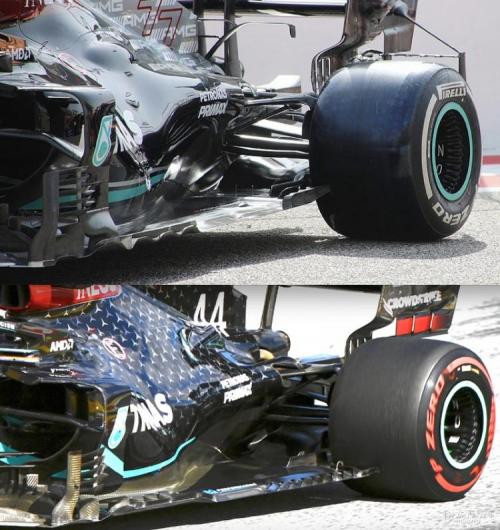 梅赛德斯此前声称他们已经找回了这部分损失的下压力,但他们显然没有预料到巴林测试的赛道环境竟如此恶劣,沙尘暴带来的高强度侧风,让本就被削弱的底板下压力变得更加不稳定。这就是梅赛德斯W12赛车车尾不稳的根源。