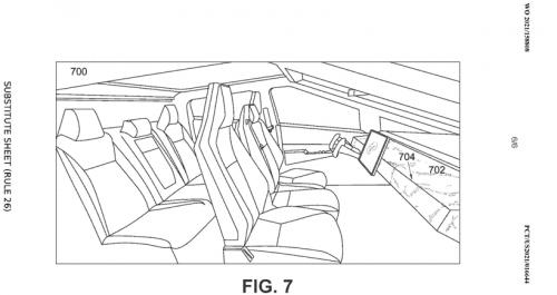“图7为车辆内部700的示例,例如上述车辆600。内部700包括具有特征线704的玻璃隔板702。如上所述,特征线704的曲率半径为2mm到5cm之间。在一些实例中,特征线704可呈现45-60度角或50-75度角。