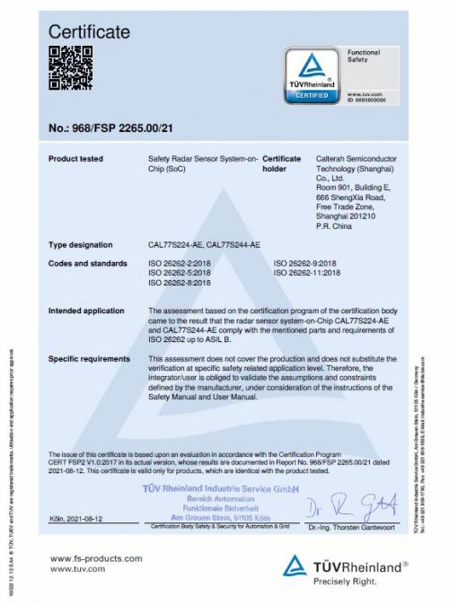2021年8月16日,加特兰微电子正式宣布Alps系列雷达SoC芯片成功通过德国莱茵TÜV审核评估,成为国内首个完全符合ISO 26262标准并获得第三方认证的芯片产品,达到ASIL-B级别。