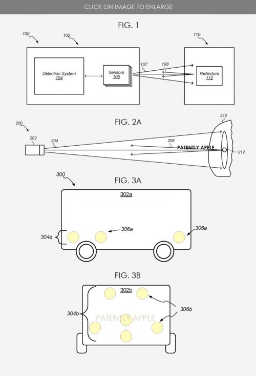 苹果专利图。下图1展示了具有一个或多个传感器的车辆的框图,该传感器用于检测另一辆车;图2a展示了被配置为向嵌入车辆中的多个反射器发送信号的传感器的侧视图;图3A和B展示了车辆的框图,该车辆具有识别车辆多个方向的多个反射器的多个图案。