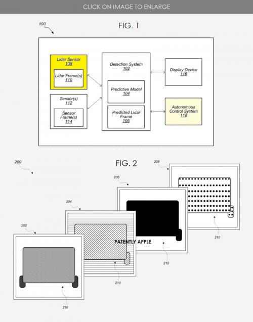 苹果的专利图。图3展示了一种模型生成系统,该系统被配置为生成预测模型以根据一个或多个传感器的一个或多个传感器帧生成预测的lidar帧;图4A-B展示了车辆捕获的传感器数据;图6A展示描绘车辆阻碍道路标志的视图的图像帧;图6B展示了由描绘环境的检测系统生成的预测lidar帧;图6C展示了基于指示道路标志的障碍部分的预测lidar帧生成的平视显示。