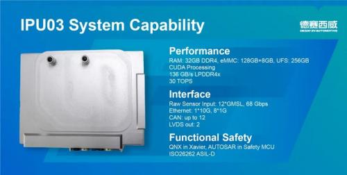 相较于IPU02,德赛西威更早开启IPU03的研发。资料显示,IPU03提供30TOPS算力,通过多传感器进行数据采集,能实时计算整车自身行驶状态以及周边环境的数据信息,实现360度全方位感知融合并做出安全的决策及控制,支持高速场景下的上下匝道、自主变道,城市道路的塞车自动跟车,低速场景下的自动泊车APA以及代客泊车AVP等功能。
