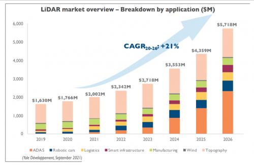 伴随着自动驾驶产业逐步进入量产落地的爬坡期,激光雷达或将迎来一波机遇。Yole就此给出预测——激光雷达市场规模将从2020年的18亿美元增至2026年的57亿美元,年均复合增长率将达到21%。就细分市场来看,虽然当下用于ADAS的激光雷达在整体市场所占比例不多(1.5%),但是预计2026年将达到41%。
