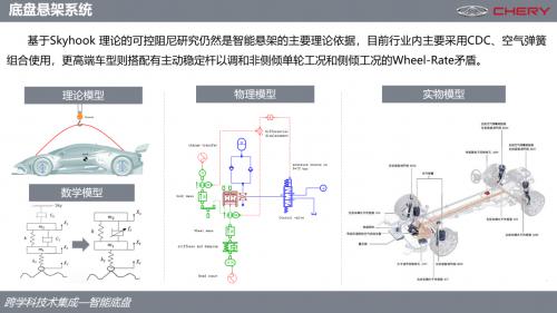 对悬架系统而言,目前主流依然使用Skyhook天棚原理来控制。如图,从左到右是其的理论模型,数学模型,物理模型,实物模型,理论模型假设与车身、天空结合在一起,无论路面多么颠簸,车身是浑然不动的。不过车身与天空的结合,实际上是无法实现的,但是我们可以通过改变阻尼器C1来间接的实现C2,因此Skyhook是主动理论悬架当中最基本的。