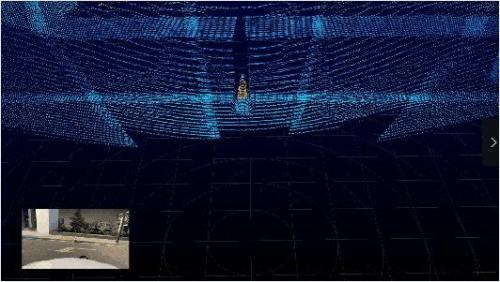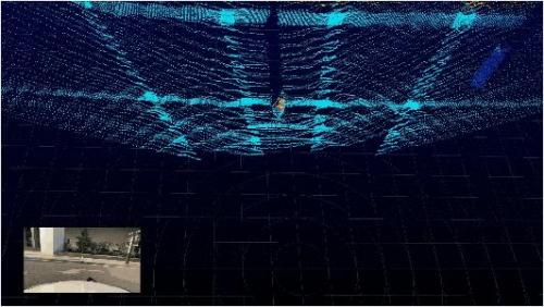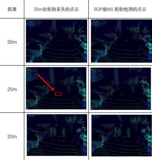 △对近场区域倒在地面的轮胎检测,左边点云出现“空洞”在25m处丢失,右边SOP版M1在不同距离下准确检出