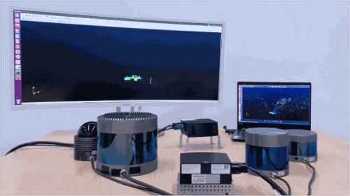 △左边大屏幕显示抗对射干扰的SOP版M1实时点云,右边屏幕没有抗干扰的实时点云