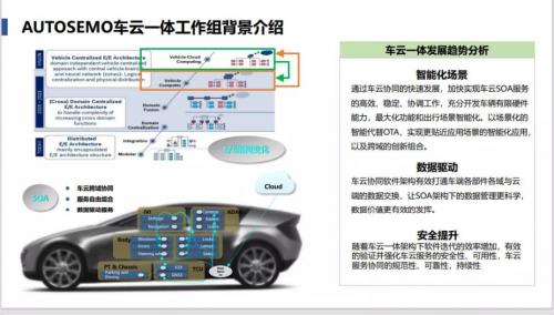 AUTOSEMO同样设立了车云一体工作组,该工作组由东软睿驰担任组长单位,广汽研究院和中汽创智担任副组长单位,联合16家车企及供应商单位共同面对在汽车行业SOA架构从讨论、预研,开始进入到实际项目实施阶段中,针对SOA架构下的车云协同相关方法、架构、设计原则、协议标准进行研究和讨论。