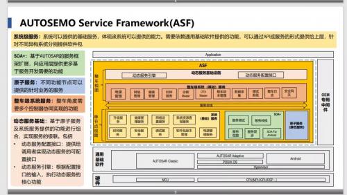 之所以创建ASF,一个关键原因在于,相关企业在域控制器实际开发过程中依然会遇到不少问题,例如主域控制器中,不同的异构核之间实现高精度时钟同步时会遇到精度损失问题等。这些问题的反复出现,会耗费大量精力,导致应用层的创新投入不足。ASF作为以服务为基础的架构,面向SOA服务开发视角,可提供系统级服务、SOA+、原子服务、整车级系统服务、动态服务等,实现软件的可复用,降低开发难度,从而节省大量的人力物力。