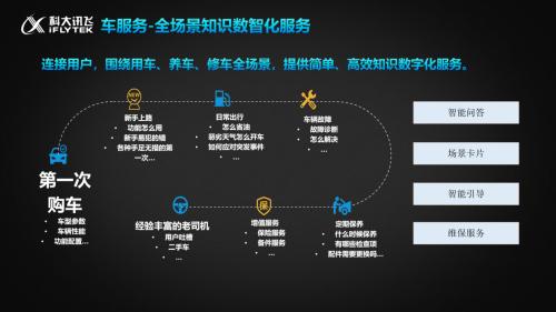 对于车主而言真正和车相关和用车相关的能力,还比较欠缺。以往在遇到这些问题时,首要选择是打电话进行厂外求助,科大讯飞正在探索一种方式让这些服务都融合到车内,围绕整个购车的周期旅程,其设计了如下的产品功能: