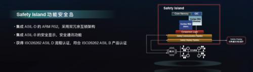 SafetyIsland:集成ASIL-D的ARM Realtime R-Core,采用双冗余互锁架构;集成ASIL-B的安全显示,安全通讯功能。