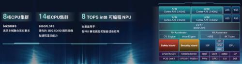 CPU:8个CPU核心,Cortex-A76 2.4GHZ主频搭配Cortex-A55主频1.8GHZ组成兼顾高性能和高能效的双处理器集群,提供面向功能安全应用的物理隔离,满足车载多域融合实时应用要求。