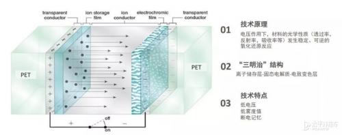 关于EC光感天幕,其原理在电压作用下,离子储存层-固态电解质-电致变色层发生微观的化学变化,离子存储层和EC层传导离子和电子,属于混合导体的类别。电解质是纯离子导体,透明导体是纯电子导体。