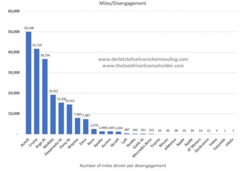而通用旗下的Cruise从一开始就在旧金山开发自动驾驶汽车,其自动驾驶车队每41,719英里(66,751公里)需要接管一次车辆,比2020年的水平(45,632公里)下降了近50%。总部位于中国的初创公司AutoX的车辆每两次人工干预之间行驶50,108英里,位居榜首。然而,该公司的累计测试里程只有Waymo的46分之一。Argo.AI也是类似,该公司去年累计路测了36,734英里,期间人工安全员也只干预了一次。