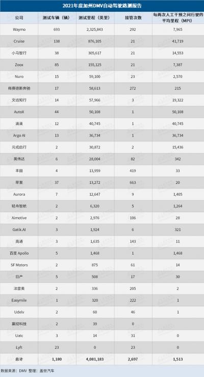 2月9日,美国加州车辆管理局(DMV)公布了《2021年自动驾驶路测报告》。一年一度的DMV自动驾驶路测报告,由取得自动驾驶牌照、并在加州进行公开自动驾驶测试的公司提供,报告中会含有各公司测试车辆的数量、测试里程,以及在测试中驾驶员人工干预的次数。自2015年开始推出以来,该报告逐渐成为外界评判自动驾驶实力的标准之一。
