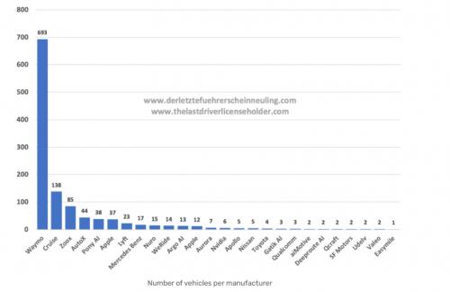 目前,有50家公司获得了在加州配备安全驾驶员的自动驾驶汽车测试的有效许可证,有7家公司获得了无人驾驶测试(车辆无需配备安全员)的许可证。