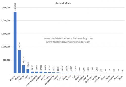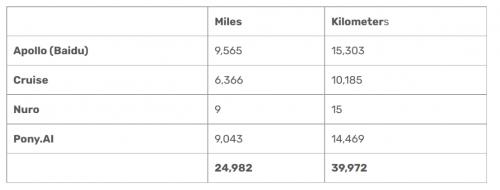 在7家取得无人驾驶路测(无需安全员)牌照的公司中,有4家(百度Apollo、Cruise、Nuro和小马智行)报告了无人驾驶路测的数据,去年,这4家公司的无人驾驶车总共行驶了24,982英里,不过去年底小马智行因为一次路测事故已经主动撤销了无人驾驶牌照。