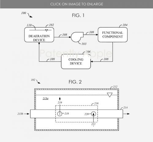 在专利背景中,苹果称液体加热和/或冷却系统会通过系统循环液体介质。液体介质可在返回其起点前在组件间移动,该过程通常被称为热回路、冷却回路或加热回路。空气可被引入液体介质中,如在填充过程中,当将液体介质添加到系统中时。液体介质中的气泡会对系统的某些部分造成腐蚀,并造成损坏。液体介质中空气也会降低系统的热性能、流速和热容量。