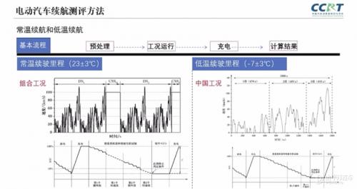 中汽中心检测认证事业部高级工程师孙龙,则带来了CCRT关于电动汽车续航测评的流程和方法。基本的测试流程包括车辆的预处理,在一个特定的环境舱中浸车,使车辆各个部件的温度保持一致,以维持在稳定的状态。