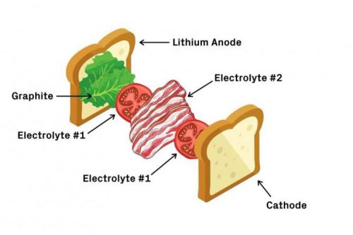 可以将电池想像为BLT三明治。首先是面包,即锂金属阳极,其次是生菜,即石墨涂层。接下来,一层西红柿,即第一种电解质,一层培根,即第二种电解质。最后再加一层西红柿和一块面包,即阴极。