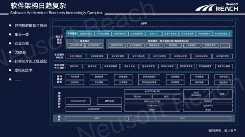 对应用层提供统一的开发视图,屏蔽不同域控制器的硬件差异,同时提供了基于服务的中间件组件,支撑整车SOA的开发及车云协同。