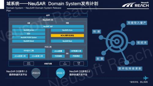 2022年4月,东软睿驰针对域控制器的软件开发平台——NeuSAR DS(Domain System)正式发布,如同电脑中的开发操作软件windows,NeuSAR DS可为智能汽车的开发提供更高效的软件开发平台、以及更完整的基础软件解决方案,使开发者可以更高效地开发出有创造力的新功能,帮助汽车行业全面、快速、低成本、无缝导入量产。