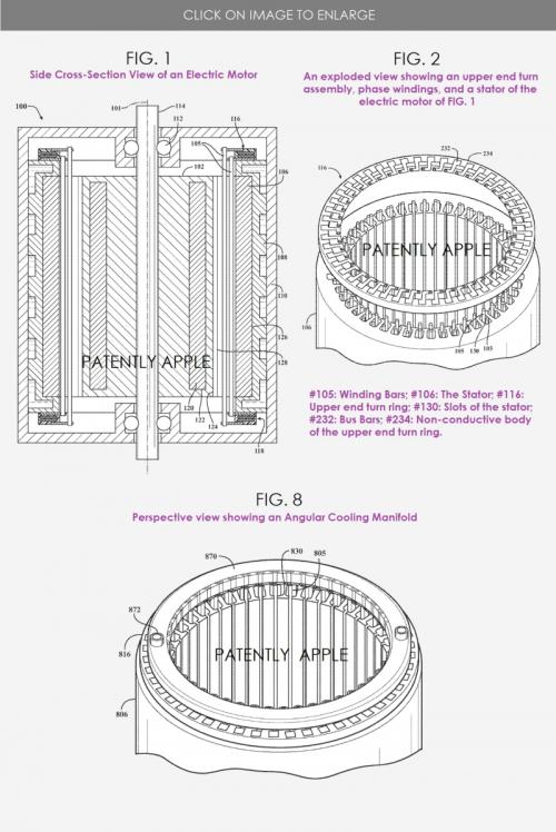该苹果专利电机包括一个定义插槽的定子主体。绕组条各自设置在由定子主体限定的一个槽中。端匝环具有上环表面和下环表面,并且包括布置成圆形阵列的汇流条。每个汇流条具有连接到一个绕组条的第一端部和连接到该绕组条的第二端部。第一端部具有限定下环表面的一部分的下杆表面。第二端部具有限定上环表面的一部分的上杆表面。冷却结构设置成与上环表面或下环表面中的至少一个具有导热关系,用于从端部转向环接收热量。
