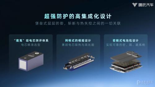 在电芯的验收部分,哪吒汽车会进行900余项的测评与选型,同时会对单体电芯内置短路的熔断保护、自开启的泄压防爆阀等安全防护。