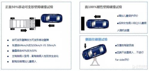 1、乘员保护部分包含碰撞试验、儿童保护静态评价和低速后碰撞颈部保护试验。其中传统汽车进行正面100%重叠刚性壁障碰撞、正面50%重叠移动渐进变形壁障碰撞和可变形移动壁障侧面碰撞三项试验。