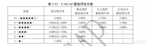 C-NCAP按照乘员保护、行人保护和主动安全三个部分的综合得分率来进行星级评价,各部分的分值如下: