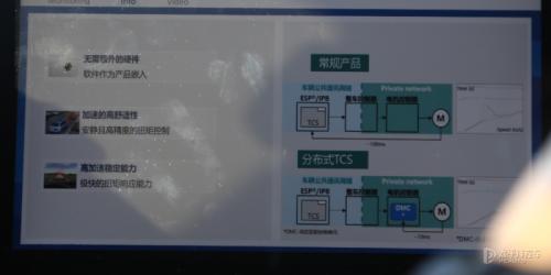 分布式TCS牵引力控制系统是整个底盘动态控制系统的核心,与传统的ESP控制系统不同,传统系统依赖于CAN总线,车轮的失控状态信号需要绕一大圈,到ESP控制芯片中识别,再上传到CAN总线由整车控制器或者域控制器计算下发指令到制定的电机控制器,最终来处理每一个轮子的状态。分布式TCS将执行计算的部分直接放在最末端,在控制电机中直接布置计算芯片,让数据流不再需要绕圈圈,将时延降低到20毫秒级别,让牵引力控制系统更加智能可控也更加安全,从大幅度提升的麋鹿测试成绩就能看到这套系统的威力。