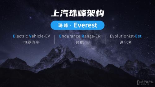 「珠峰」架构是上汽顺应电动化、智能化、网联化的时代浪潮,基于全球标准打造的整车架构,Electric Vehicle电驱汽车(包含字母EV)、Endurance Range续航(包含字母ER)、Evolutionist进化者(包含字母Est)组成了Everest,即「珠峰」的英文。