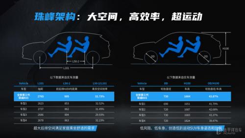 「珠峰」架构具备“大带宽、超舒适、全动力、高操控、超安全”等优势,派生出“向电驱化演进且续航无忧”的全球车型。整个珠峰架构包含了10种动力组合,其中有包含5种发动机+变速箱驱动系统;空间方面,整车产品乘坐空间效率最高可达70%。